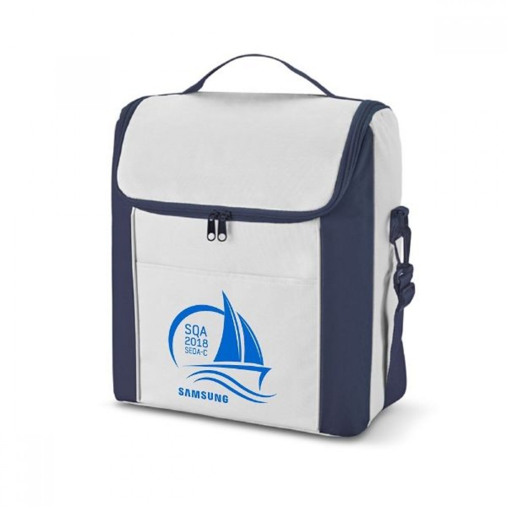 Bolsa térmica em nylon 600D. Com alça ajustável em webbing e bolso frontal. Capacidade até 12 litros.
