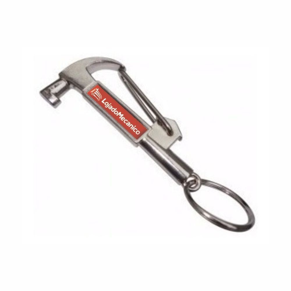 Chaveiro metálico formato martelo, com argola e personalização em resina.